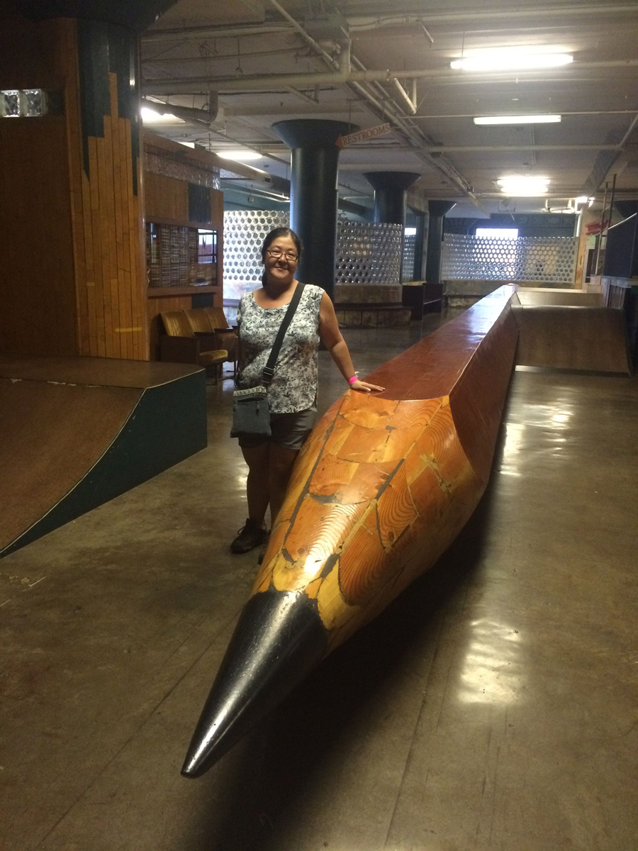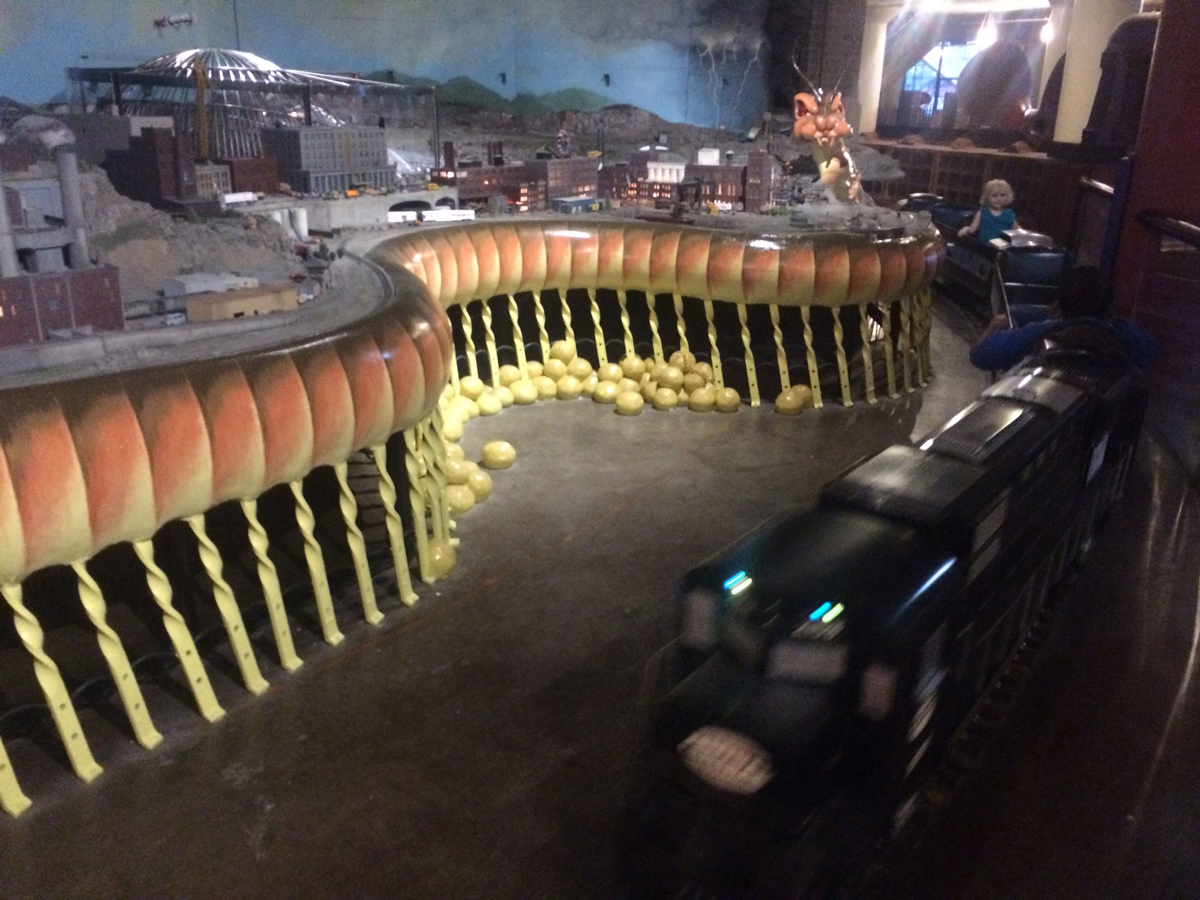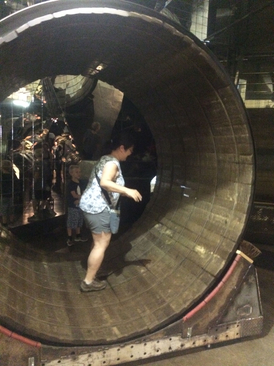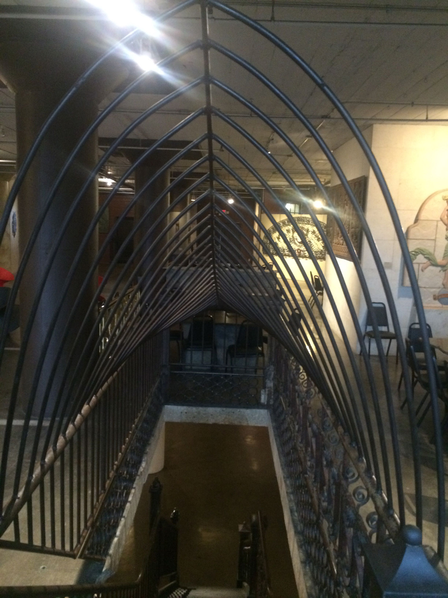 Then we got to the fork in the road – do we go up in the arch for a view of the city, or do we go to the City Museum (which we’d seen a hint of the day before – there is a 30 foot ferris wheel on the roof!) Well, we decided that we’d try both but that we’d first go to the museum. We were there for quite a while actually, and it was absolutely the most amazing place I’ve seen in a LONG time! It was curated by a madman who died a few years ago, but it continues to be modified and built upon. It currently takes up four floors of a 15-story-or-so downtown building, and then the stuff on the roof which we didn’t get to see on account of the rain…but no problems, the first four floors were enough! It’s really hard to describe, but it’s full of donated stuff, and there are all kinds of places to explore – welded steel spiral staircases to the next floor, hidden passages and even a ‘cave’ section which housed dinosaurs in the walls, all kinds of spidery steel staircases, and a five as well as a ten story slide which goes form the top of the building to the ground! It’s absolutely glorious madness, and I am at a loss to even properly describe it…but I will share some pix at the bottom of course. I said several times to Sandra that my brother-in-law Norm would absolutely love this place…